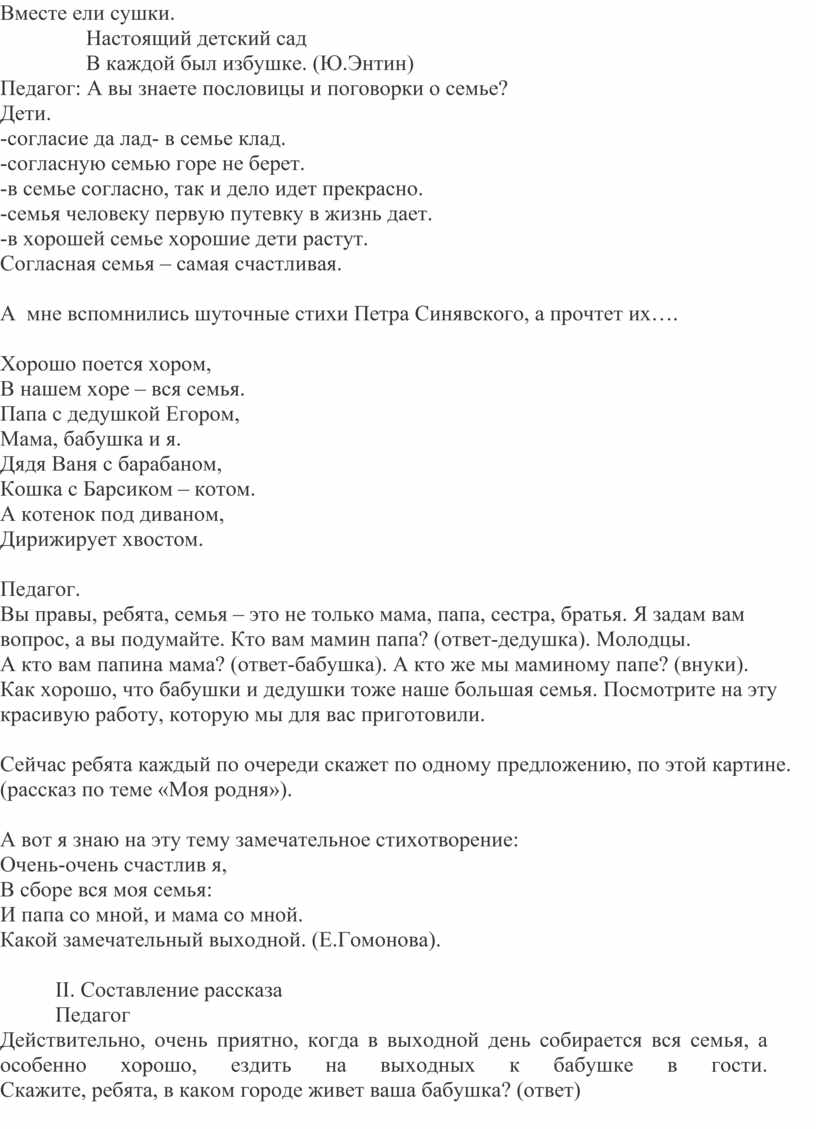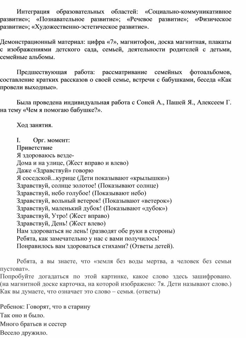 Предшествующая работа: рассматривание семейных фотоальбомов, составление кратких рассказов о своей семье, встречи с бабушками, беседа «Как провели выходные».