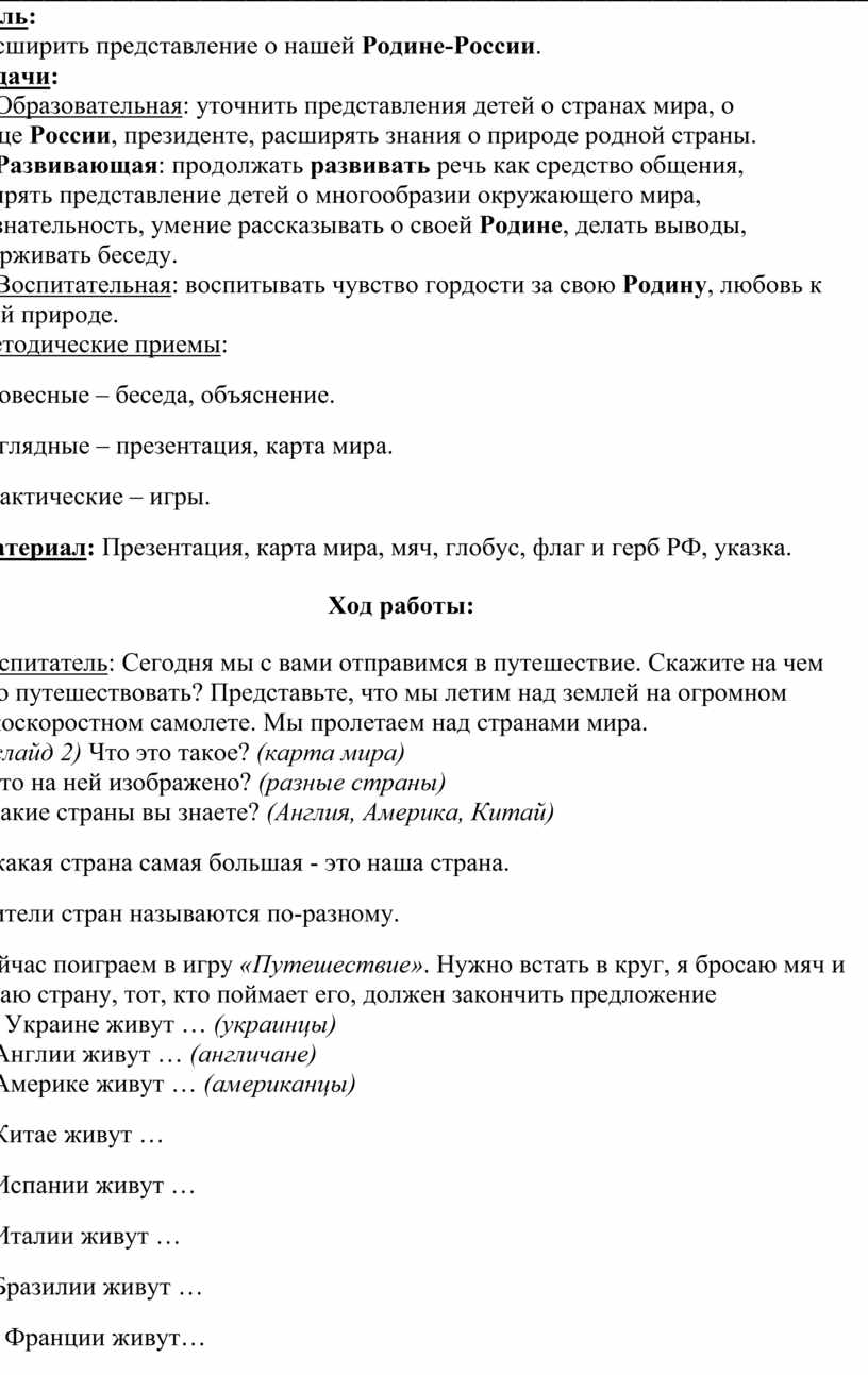 1. Образовательная: уточнить представления детей о странах мира, о столице России, президенте, расширять знания о природе родной страны.