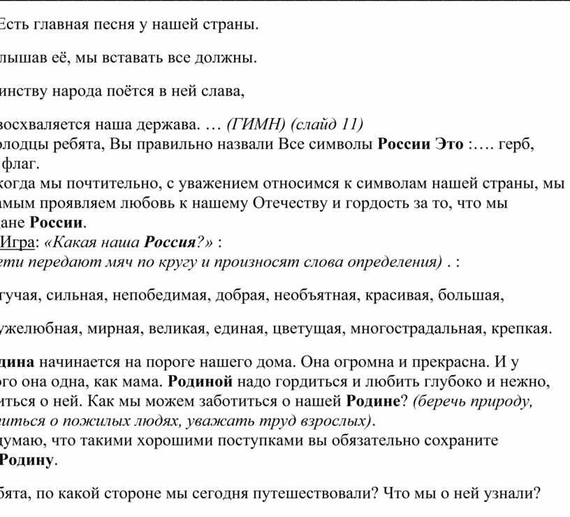 Родина начинается на пороге нашего дома. Она огромна и прекрасна. И у каждого она одна, как мама. Родиной надо гордиться и любить глубоко и нежно, заботиться о ней. Как мы можем заботиться о нашей Родине? (беречь природу, заботиться о пожилых людях, уважать труд взрослых).