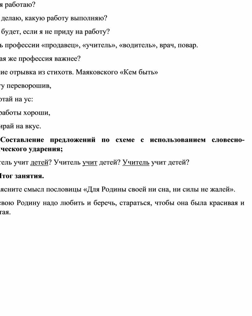 Материал: иллюстрации с изображением предприятий города, людей разных профессий, стихотворение «Мой край» И. Никитиной, схема предложения с обозначением словесно-логического ударения; дидактическая игра «Кому что нужно».