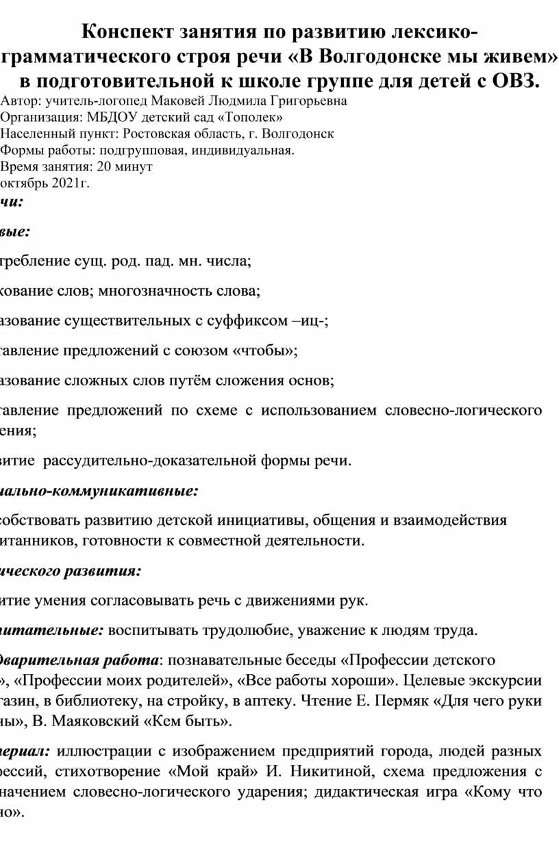 Конспект занятия по развитию лексико-грамматического строя речи «В Волгодонске мы живем» в подготовительной к школе группе для детей с ОВЗ.