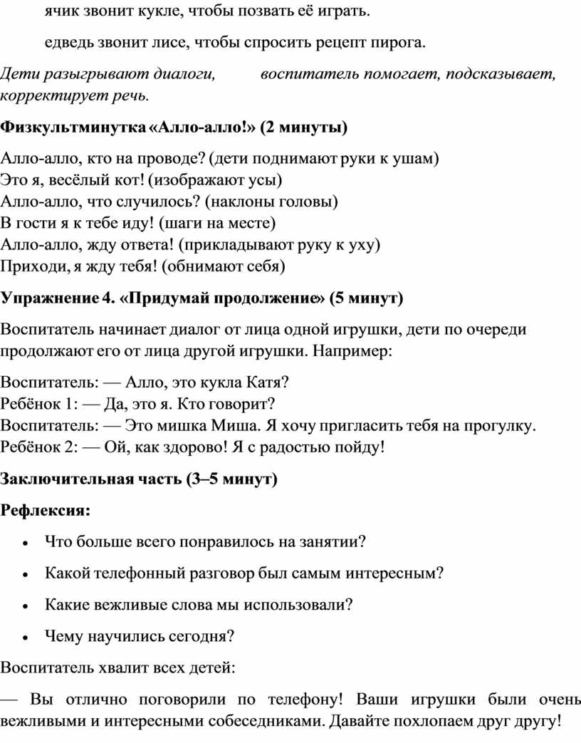Цель: развитие связной диалогической речи и творческого воображения через моделирование телефонных разговоров между игрушками.