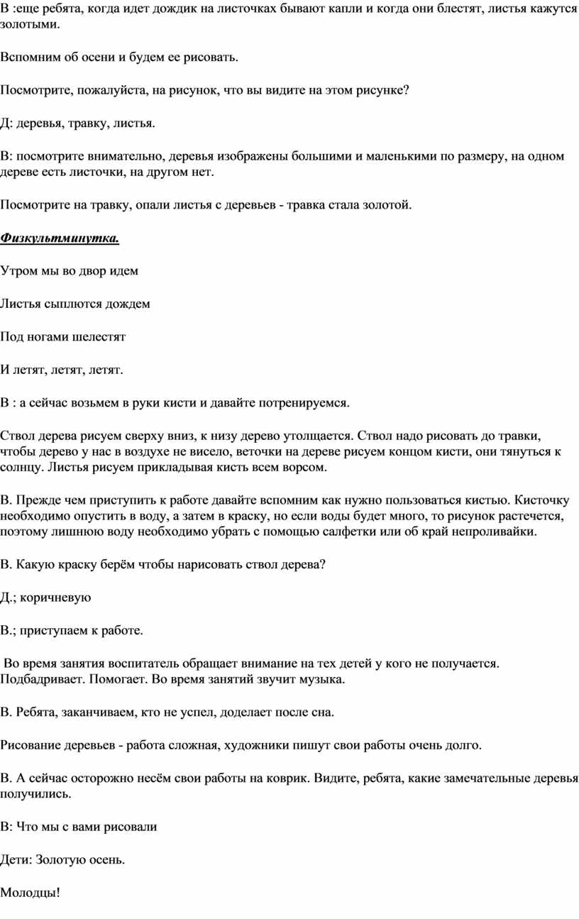Задачи: 1) продолжать учить детей отражать в рисунке осенние впечатления, рисовать разнообразные формы деревьев, (большие, маленькие, высокие, стройные, продолжать изображать траву и листья)