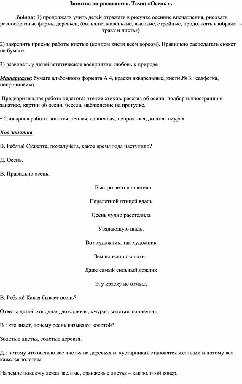 Предварительная работа педагога: чтение стихов, рассказ об осени, подбор иллюстрации к занятию, картин об осени, беседа, наблюдение на прогулке.