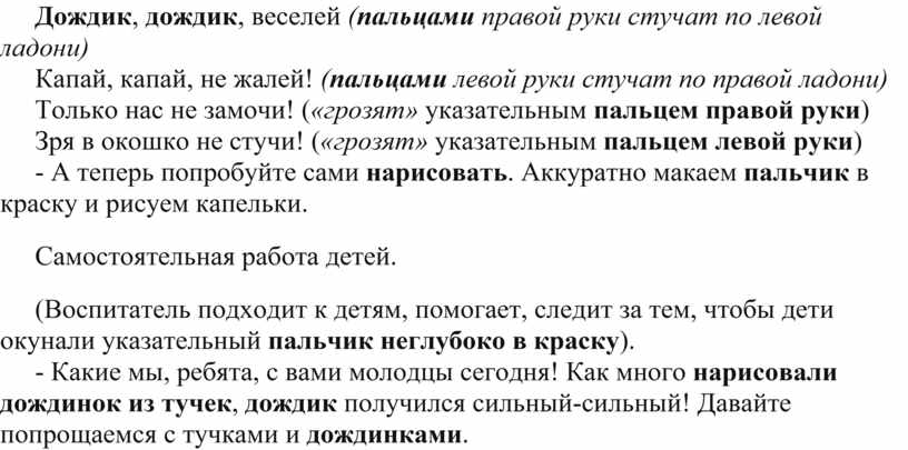 - Какие мы, ребята, с вами молодцы сегодня! Как много нарисовали дождинок из тучек, дождик получился сильный-сильный! Давайте попрощаемся с тучками и дождинками.