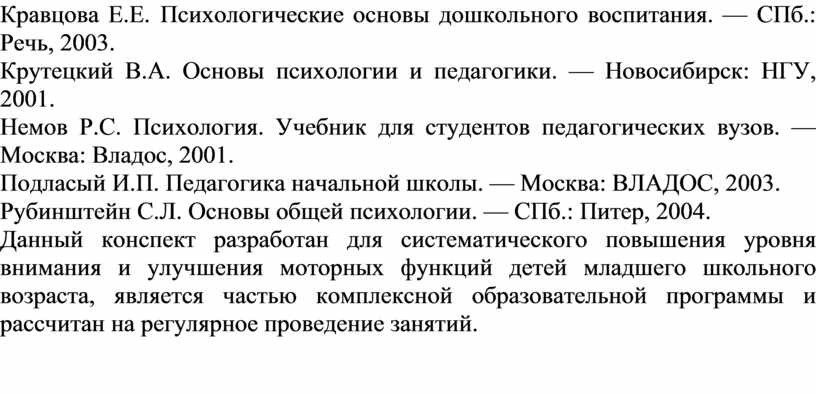 Кравцова Е.Е. Психологические основы дошкольного воспитания. — СПб.: Речь, 2003.
