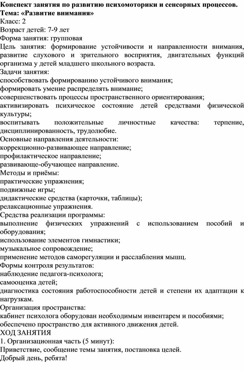 Данный конспект разработан для систематического повышения уровня внимания и улучшения моторных функций детей младшего школьного возраста, является частью комплексной образовательной программы и рассчитан на регулярное проведение занятий.
