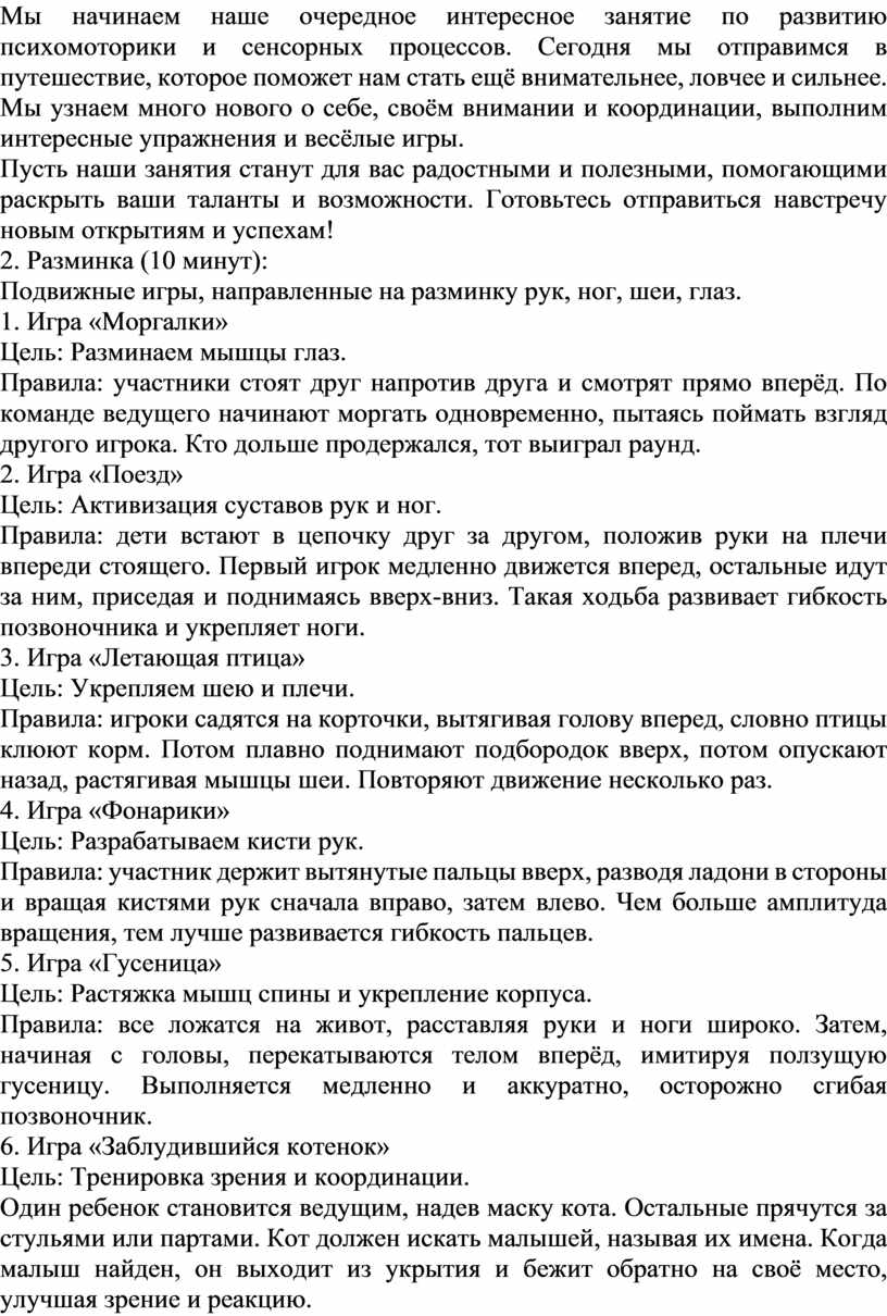 Мы начинаем наше очередное интересное занятие по развитию психомоторики и сенсорных процессов. Сегодня мы отправимся в путешествие, которое поможет нам стать ещё внимательнее, ловчее и сильнее. Мы узнаем много нового о себе, своём внимании и координации, выполним интересные упражнения и весёлые игры.