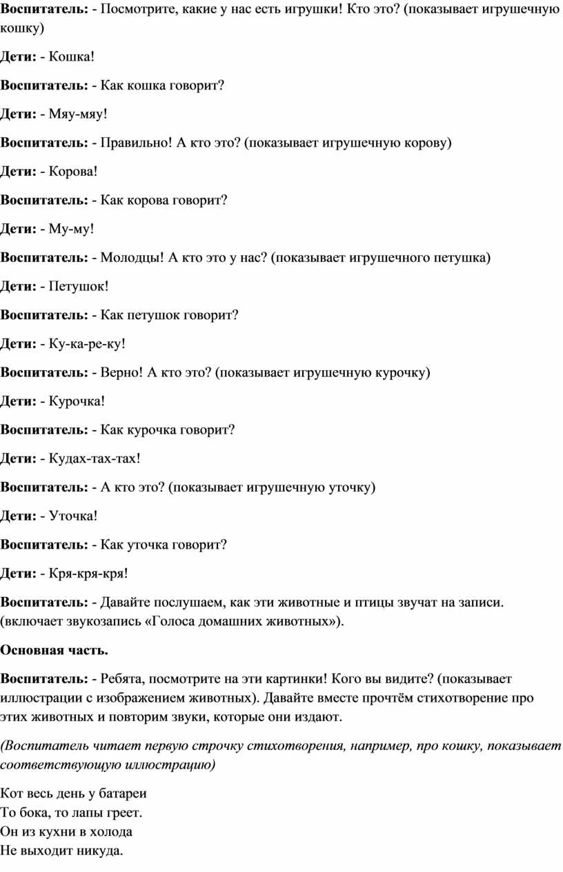 Воспитатель: - Посмотрите, какие у нас есть игрушки! Кто это? (показывает игрушечную кошку)