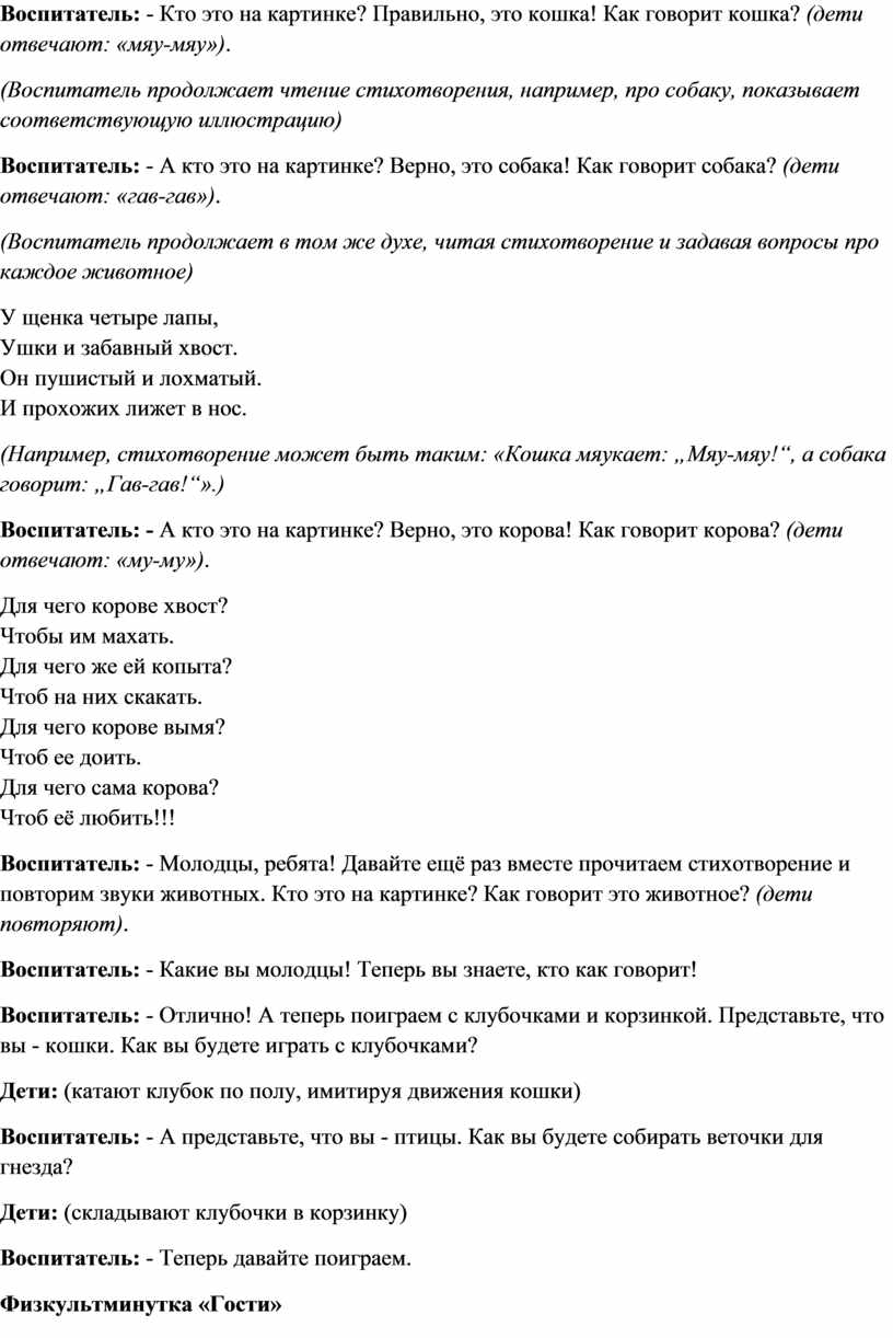 Воспитатель: - Кто это на картинке? Правильно, это кошка! Как говорит кошка? (дети отвечают: «мяу-мяу»).