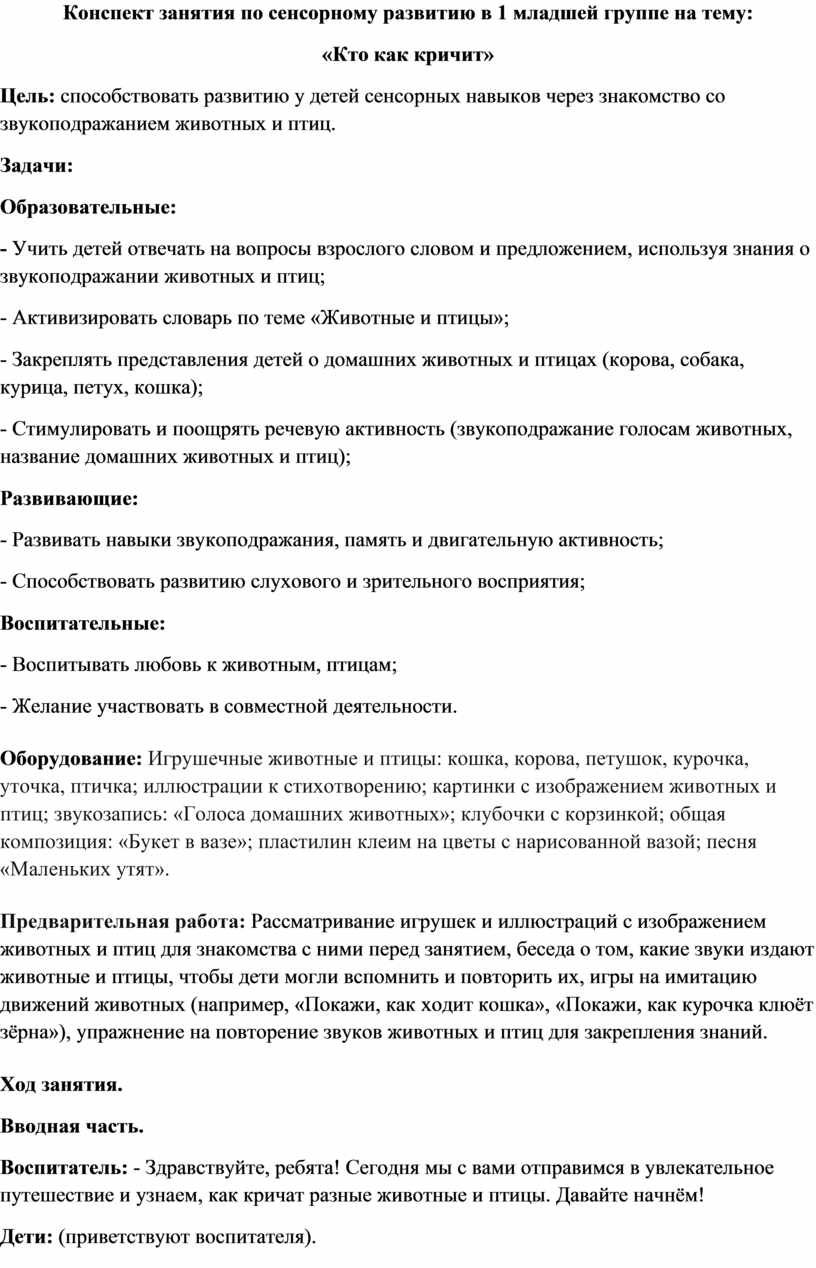 Цель: способствовать развитию у детей сенсорных навыков через знакомство со звукоподражанием животных и птиц.
