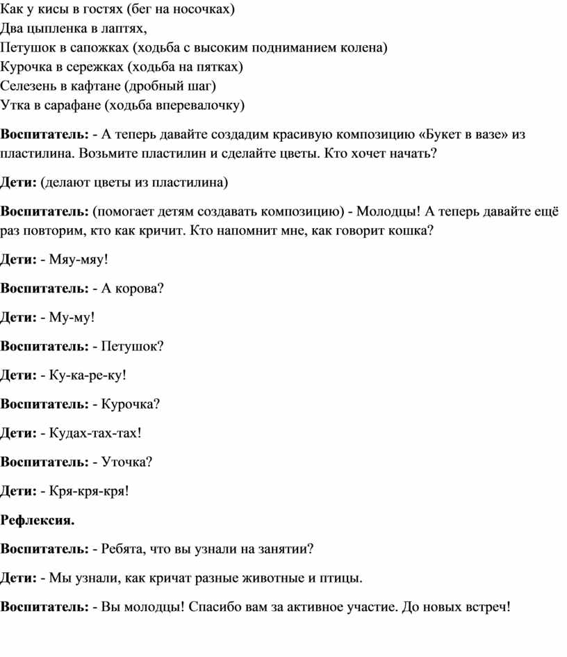 Оборудование: Игрушечные животные и птицы: кошка, корова, петушок, курочка, уточка, птичка; иллюстрации к стихотворению; картинки с изображением животных и птиц; звукозапись: «Голоса домашних животных»; клубочки с корзинкой; общая композиция: «Букет в вазе»; пластилин клеим на цветы с нарисованной вазой; песня «Маленьких утят».