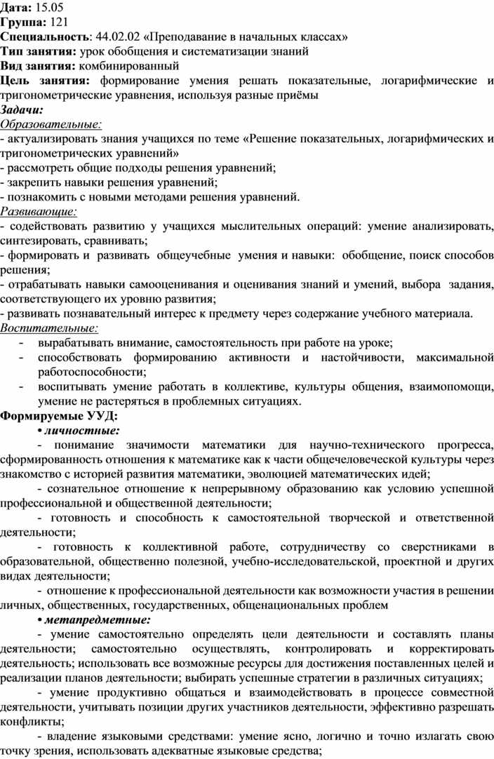 - актуализировать знания учащихся по теме «Решение показательных, логарифмических и тригонометрических уравнений»