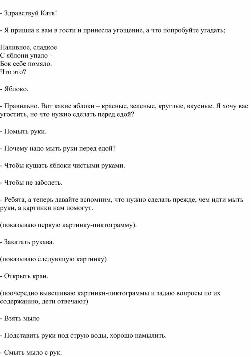 - Правильно. Вот какие яблоки – красные, зеленые, круглые, вкусные. Я хочу вас угостить, но что нужно сделать перед едой?