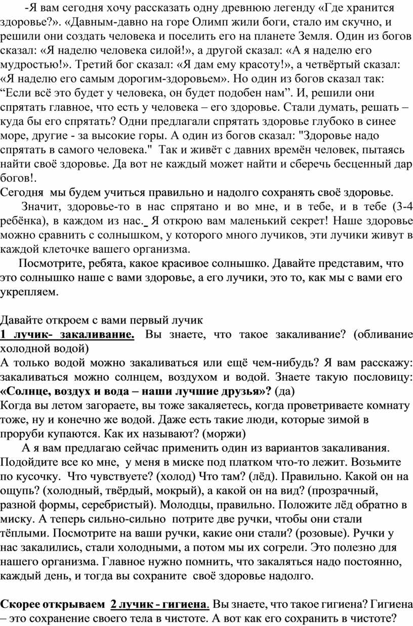 -Я вам сегодня хочу рассказать одну древнюю легенду «Где хранится здоровье?». «Давным-давно на горе Олимп жили боги, стало им скучно, и решили они создать человека и поселить его на планете Земля. Один из богов сказал: «Я наделю человека силой!», а другой сказал: «А я наделю его мудростью!». Третий бог сказал: «Я дам ему красоту!», а четвёртый сказал: «Я наделю его самым дорогим-здоровьем». Но один из богов сказал так: “Если всё это будет у человека, он будет подобен нам”. И, решили они спрятать главное, что есть у человека – его здоровье. Стали думать, решать – куда бы его спрятать? Одни предлагали спрятать здоровье глубоко в синее море, другие - за высокие горы. А один из богов сказал: "Здоровье надо спрятать в самого человека." Так и живёт с давних времён человек, пытаясь найти своё здоровье. Да вот не каждый может найти и сберечь бесценный дар богов!.