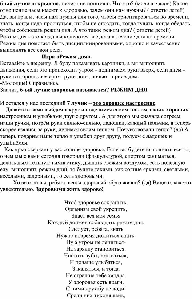 6-ый лучик открываю, ничего не понимаю. Что это? (модель часов) Какое отношение часы имеют к здоровью, зачем они нам нужны? ( ответы детей)