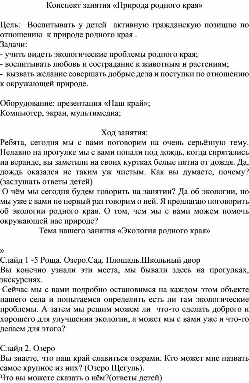 Цель: Воспитывать у детей активную гражданскую позицию по отношению к природе родного края .