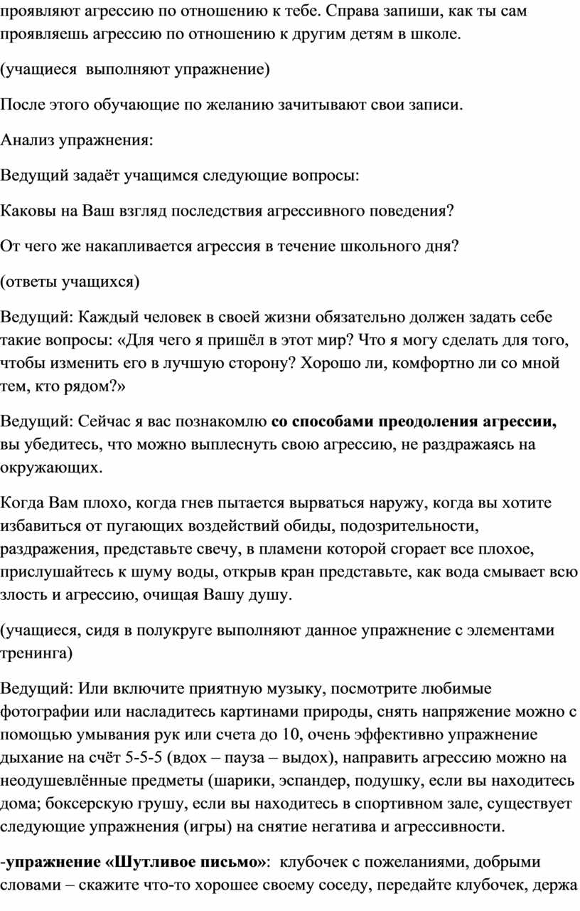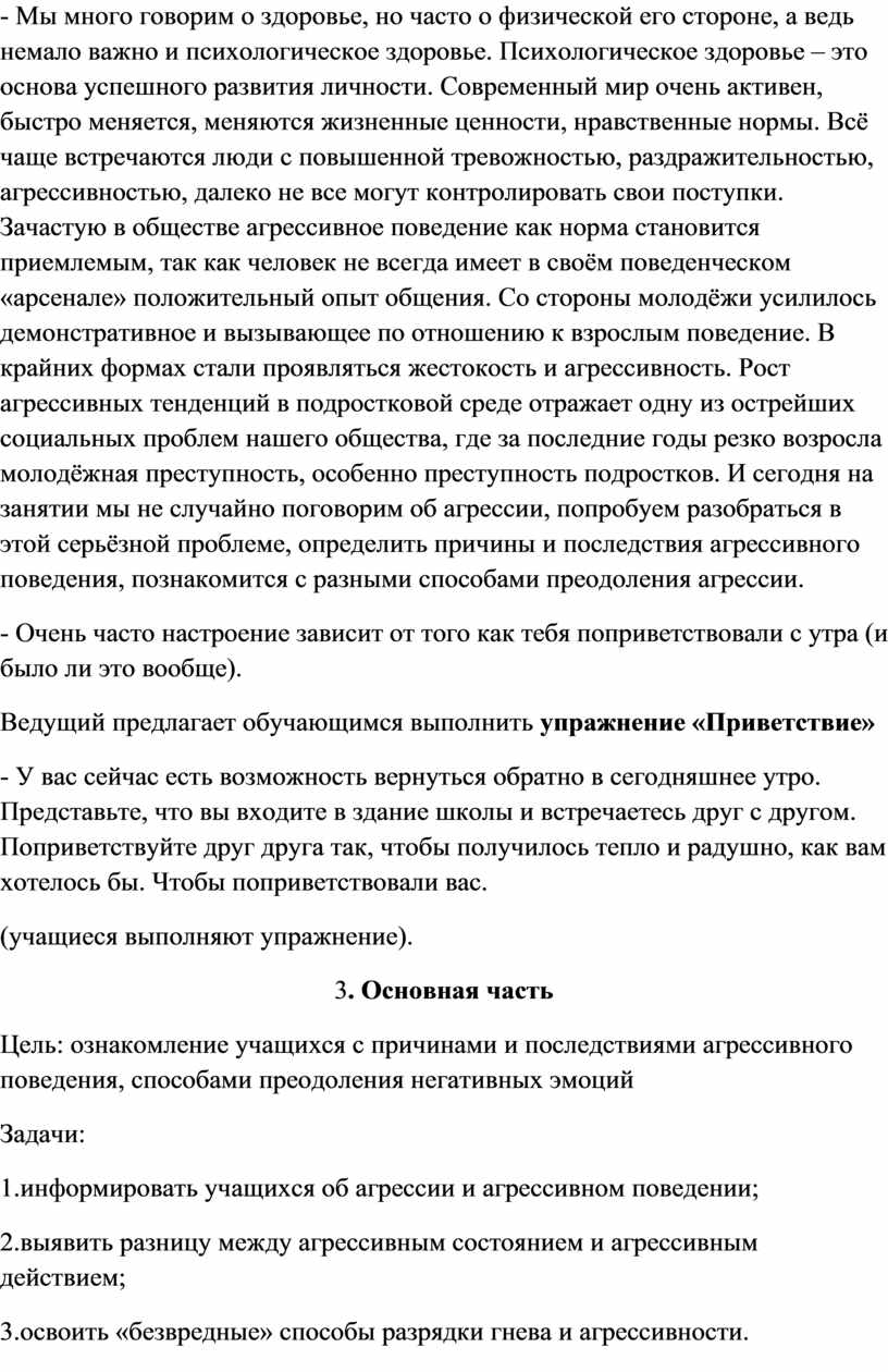 Цель: ознакомление учащихся с причинами и последствиями агрессивного поведения, способами преодоления негативных эмоций