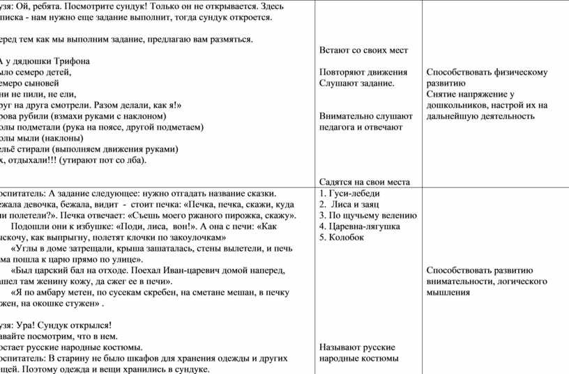 Воспитатель: А задание следующее: нужно отгадать название сказки. Бежала девочка, бежала, видит - стоит печка: «Печка, печка, скажи, куда они полетели?». Печка отвечает: «Съешь моего ржаного пирожка, скажу». 2. Подошли они к избушке: «Поди, лиса, вон!». А она с печи: «Как выскочу, как выпрыгну, полетят клочки по закоулочкам» 3. «Углы в доме затрещали, крыша зашаталась, стены вылетели, и печь сама пошла к царю прямо по улице». 4. «Был царский бал на отходе. Поехал Иван-царевич домой наперед, нашел там женину кожу, да сжег ее в печи». 5. «Я по амбару метен, по сусекам скребен, на сметане мешан, в печку сажен, на окошке стужен» .
