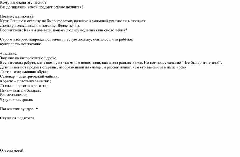 4 задание. Задание на интерактивной доске. Воспитатель: ребята, мы с вами уже так много вспомнили, как жили раньше люди. Но вот новое задание "Что было, что стало?". Дети называют предмет старины, изображенный на слайде, и рассказывают, чем его заменили в наше время. Лапти - современная обувь; Самовар – электрический чайник; Корыто – пластмассовый таз; Люлька – детская кроватка; Печь – плита и батарея; Веник-пылесос; Чугунок-кастрюля.
