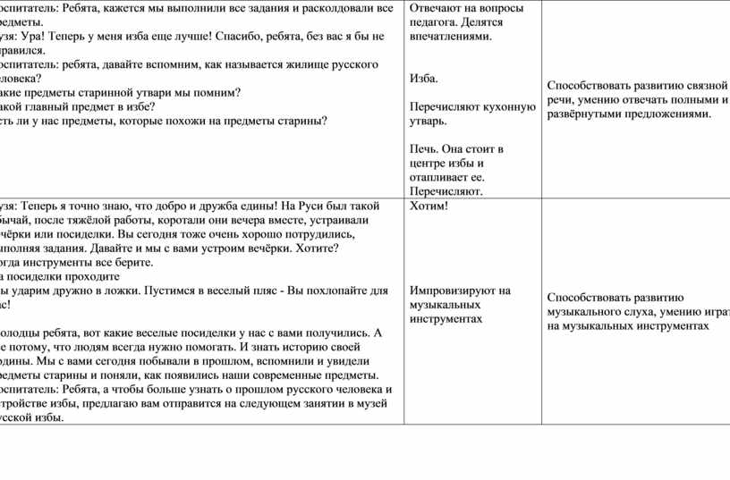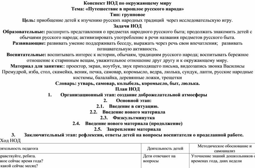 Воспитательные: воспитывать интерес к истории, обычаям, традициям русского народа; воспитывать бережное отношение к старинным вещам, уважительное отношение друг другу и к окружающему миру.