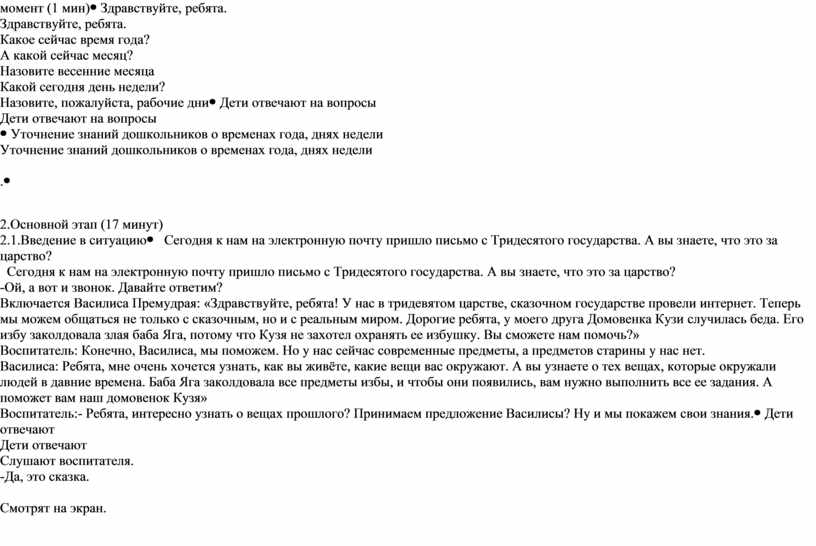 Сегодня к нам на электронную почту пришло письмо с Тридесятого государства. А вы знаете, что это за царство? -Ой, а вот и звонок. Давайте ответим? Включается Василиса Премудрая: «Здравствуйте, ребята! У нас в тридевятом царстве, сказочном государстве провели интернет. Теперь мы можем общаться не только с сказочным, но и с реальным миром. Дорогие ребята, у моего друга Домовенка Кузи случилась беда. Его избу заколдовала злая баба Яга, потому что Кузя не захотел охранять ее избушку. Вы сможете нам помочь?» Воспитатель: Конечно, Василиса, мы поможем. Но у нас сейчас современные предметы, а предметов старины у нас нет. Василиса: Ребята, мне очень хочется узнать, как вы живёте, какие вещи вас окружают. А вы узнаете о тех вещах, которые окружали людей в давние времена. Баба Яга заколдовала все предметы избы, и чтобы они появились, вам нужно выполнить все ее задания. А поможет вам наш домовенок Кузя» Воспитатель:- Ребята, интересно узнать о вещах прошлого? Принимаем предложение Василисы? Ну и мы покажем свои знания. |