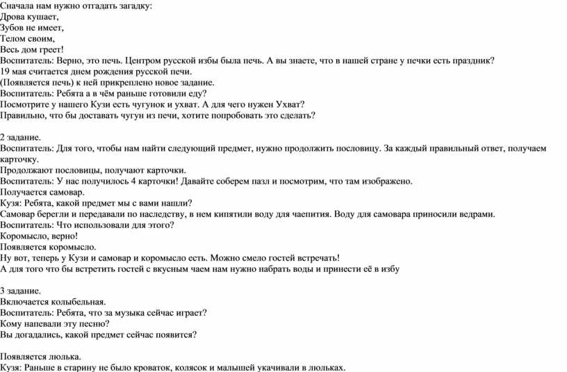 Появляется домовенок. Кузя: Привет, ребята! Я так рад, что вы мне поможете, одному мне не справиться! Баба Яга разозлилась на меня из-за того, что я не согласился охранять ее избушку. Ведь она делает всем зло. Воспитатель: раньше наши предки верили, что домовые есть в каждом доме, и они охраняют их. Кузя: Изба без утвари не может быть обжитой избой. Чтобы найти старинные вещи для избы нам нужно выполнить задания. Воспитатель: посмотрите, какое новое для нас слово «утварь». Как вы думаете, что оно означает? Объясняет значение слова. Кузя достает мешочек с заданиями. Кузя: Давайте посмотрим первое задание. 1 задание. Сначала нам нужно отгадать загадку: Дрова кушает, Зубов не имеет, Телом своим, Весь дом греет! Воспитатель: Верно, это печь. Центром русской избы была печь. А вы знаете, что в нашей стране у печки есть праздник? 19 мая считается днем рождения русской печи. (Появляется печь) к ней прикреплено новое задание. Воспитатель: Ребята а в чём раньше готовили еду? Посмотрите у нашего Кузи есть чугунок и ухват. А для чего нужен Ухват? Правильно, что бы доставать чугун из печи, хотите попробовать это сделать?