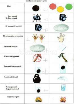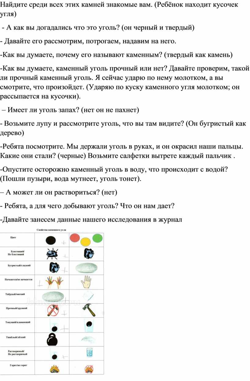 Познакомить детей с внешним видом и свойствами каменного угля через его исследование (цвет, твердость, запах).