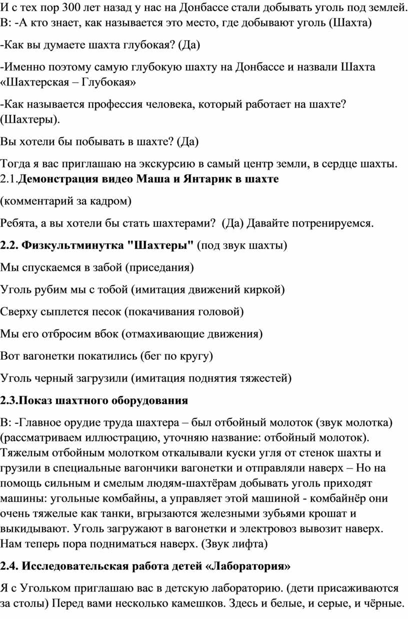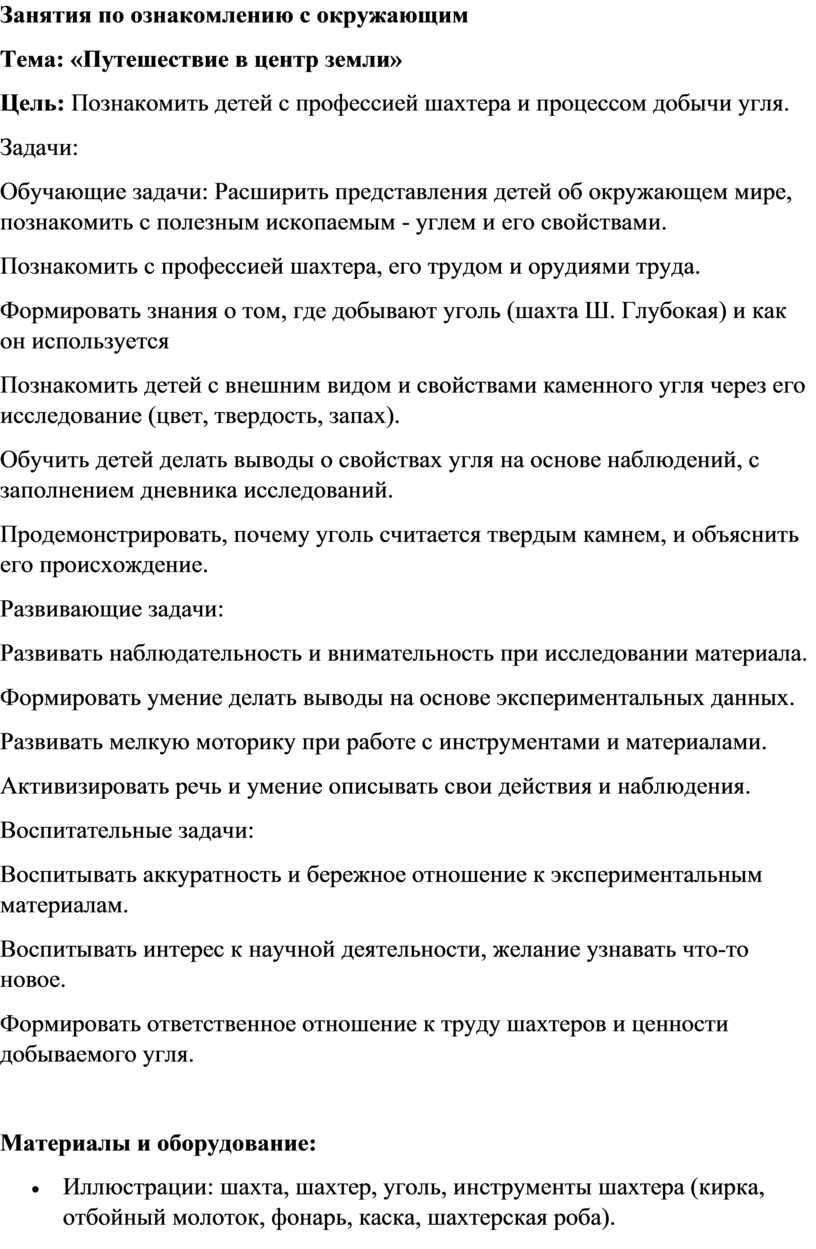 Цель: Познакомить детей с профессией шахтера и процессом добычи угля.