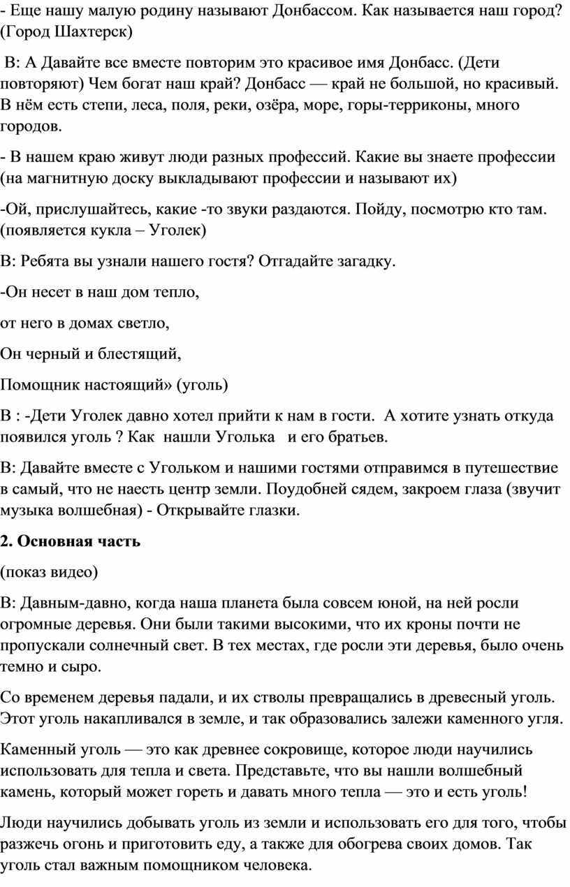 В: А Давайте все вместе повторим это красивое имя Донбасс. (Дети повторяют) Чем богат наш край? Донбасс — край не большой, но красивый. В нём есть степи, леса, поля, реки, озёра, море, горы-терриконы, много городов.
