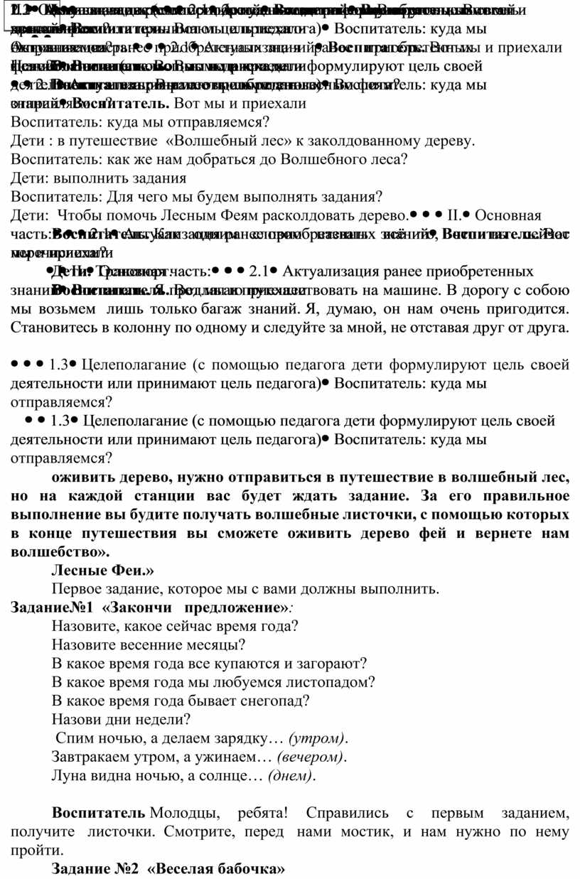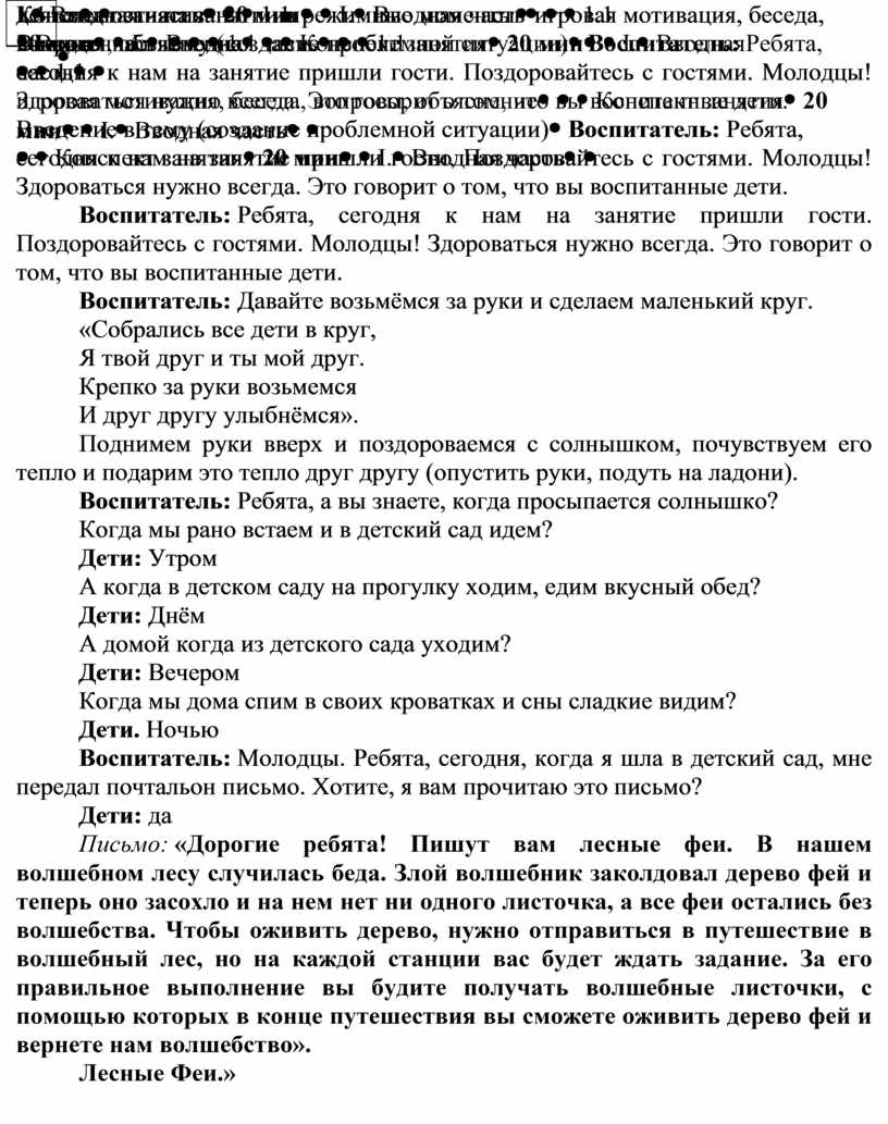 Воспитатель: Ребята, сегодня к нам на занятие пришли гости. Поздоровайтесь с гостями. Молодцы! Здороваться нужно всегда. Это говорит о том, что вы воспитанные дети. Воспитатель: Давайте возьмёмся за руки и сделаем маленький круг. «Собрались все дети в круг, Я твой друг и ты мой друг. Крепко за руки возьмемся И друг другу улыбнёмся». Поднимем руки вверх и поздороваемся с солнышком, почувствуем его тепло и подарим это тепло друг другу (опустить руки, подуть на ладони). Воспитатель: Ребята, а вы знаете, когда просыпается солнышко? Когда мы рано встаем и в детский сад идем? Дети: Утром А когда в детском саду на прогулку ходим, едим вкусный обед? Дети: Днём А домой когда из детского сада уходим? Дети: Вечером Когда мы дома спим в своих кроватках и сны сладкие видим? Дети. Ночью Воспитатель: Молодцы. Ребята, сегодня, когда я шла в детский сад, мне передал почтальон письмо. Хотите, я вам прочитаю это письмо? Дети: да Письмо: «Дорогие ребята! Пишут вам лесные феи. В нашем волшебном лесу случилась беда. Злой волшебник заколдовал дерево фей и теперь оно засохло и на нем нет ни одного листочка, а все феи остались без волшебства. Чтобы оживить дерево, нужно отправиться в путешествие в волшебный лес, но на каждой станции вас будет ждать задание. За его правильное выполнение вы будите получать волшебные листочки, с помощью которых в конце путешествия вы сможете оживить дерево фей и вернете нам волшебство». Лесные Феи.»