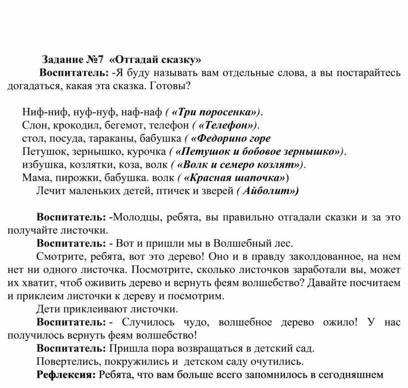 Воспитатель: -Молодцы, ребята, вы правильно отгадали сказки и за это получайте листочки. Воспитатель: - Вот и пришли мы в Волшебный лес. Смотрите, ребята, вот это дерево! Оно и в правду заколдованное, на нем нет ни одного листочка. Посмотрите, сколько листочков заработали вы, может их хватит, чтоб оживить дерево и вернуть феям волшебство? Давайте посчитаем и приклеим листочки к дереву и посмотрим. Дети приклеивают листочки. Воспитатель: - Случилось чудо, волшебное дерево ожило! У нас получилось вернуть феям волшебство! Воспитатель: Пришла пора возвращаться в детский сад. Повертелись, покружились и детском саду очутились.