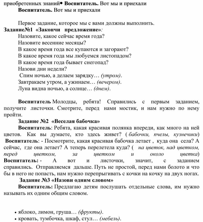 Закреплять умение различать и называть времена года, части суток, дни недели; Закреплять грамматический строй речи: обучать пониманию пространственных отношений двух предметов. выраженных предлогами; над. под. около, за; Закреплять умения подбирать слова, подходящие по смыслу; Закреплять умения образовывать «ласковые слова» (с уменьшительно-ласкательным суффиксом); Закреплять представление о сказках;