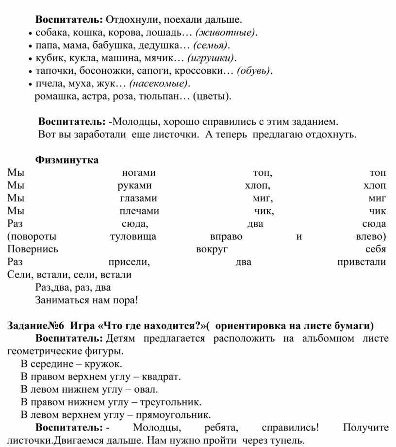 Воспитатель: Отдохнули, поехали дальше. Задание№6 Игра «Что где находится?»( ориентировка на листе бумаги) Воспитатель: Детям предлагается расположить на альбомном листе геометрические фигуры. В середине – кружок. В правом верхнем углу – квадрат. В левом нижнем углу – овал. В правом нижнем углу – треугольник. В левом верхнем углу – прямоугольник. Воспитатель: - Молодцы, ребята, справились! Получите листочки.Двигаемся дальше. Нам нужно пройти через тунель.