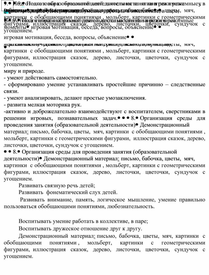 Демонстрационный материал: письмо, бабочка, цветы, мяч, картинки с обобщающими понятиями , мольберт, картинки с геометрическими фигурами, иллюстрация сказок, дерево, листочки, цветочки, сундучок с угощением.
