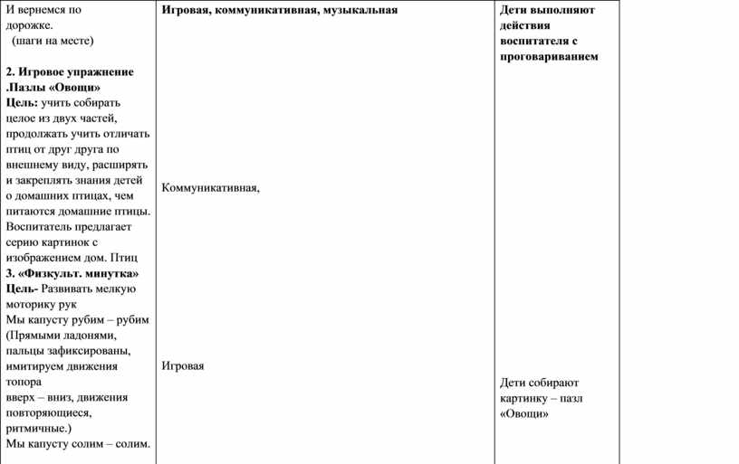 2. Игровое упражнение .Пазлы «Овощи» Цель: учить собирать целое из двух частей, продолжать учить отличать птиц от друг друга по внешнему виду, расширять и закреплять знания детей о домашних птицах, чем питаются домашние птицы. Воспитатель предлагает серию картинок с изображением дом. Птиц 3. «Физкульт. минутка» Цель- Развивать мелкую моторику рук Мы капусту рубим – рубим (Прямыми ладонями, пальцы зафиксированы, имитируем движения топора вверх – вниз, движения повторяющиеся, ритмичные.) Мы капусту солим – солим. (Поочередное поглаживание подушечек пальцев, пальцы собраны щепоть – имитация соления.) Мы капусту трём- трём. (Трение кулачка о кулачок – движения вертикально вверх- вниз.) Мы капусту жмём – жмём. (Энергично сжимаем пальцы в кулак, сжимаем и разжимаем, движения ритмичные, одновременные.) Ребята наша Катя пока играла с нами проголодалась, а давайте для нее приготовим суп. |