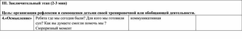 III. Заключительный этап (2-3 мин) Цель: организация рефлексии и самооценки детьми своей тренировочной или обобщающей деятельности. |