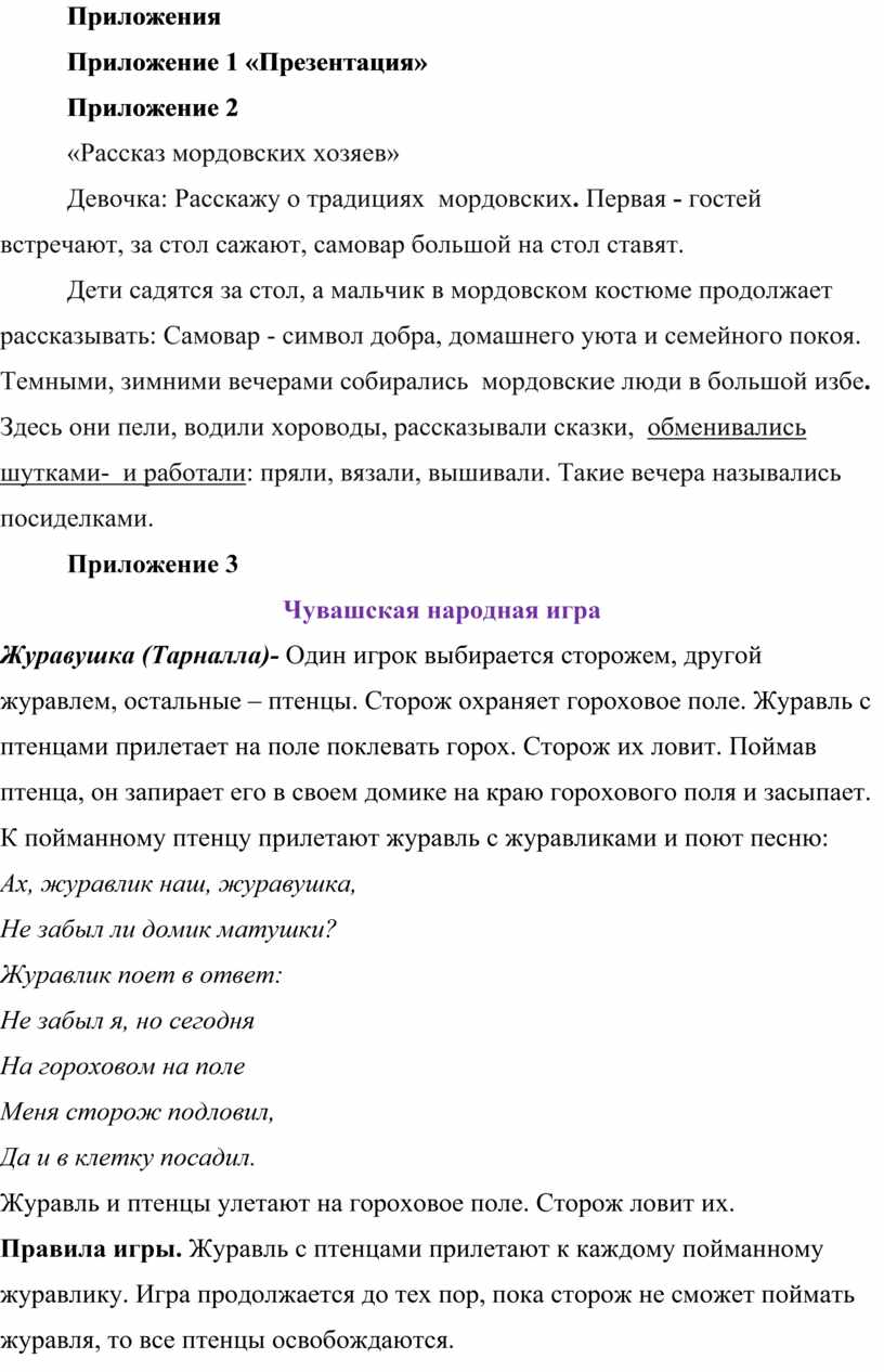 А какие вы знаете мордовские народные сказки? Предлагаю отправляться дальше в гости к чувашским друзьям. Воспитатель вместе с детьми под музыку подходят к чувашской избе, и их встречает девочка в чувашском национальном костюме (приложение4).
