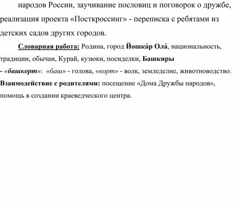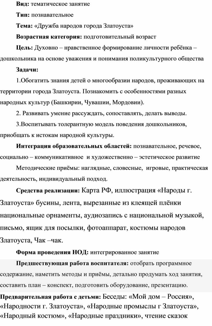Предварительная работа с детьми: Беседы: «Мой дом – Россия», «Народности г. Златоуста», «Народные промыслы г Златоуста», «Народный костюм», «Народные праздники», чтение сказок народов России, заучивание пословиц и поговорок о дружбе, реализация проекта «Посткроссинг» - переписка с ребятами из детских садов других городов.