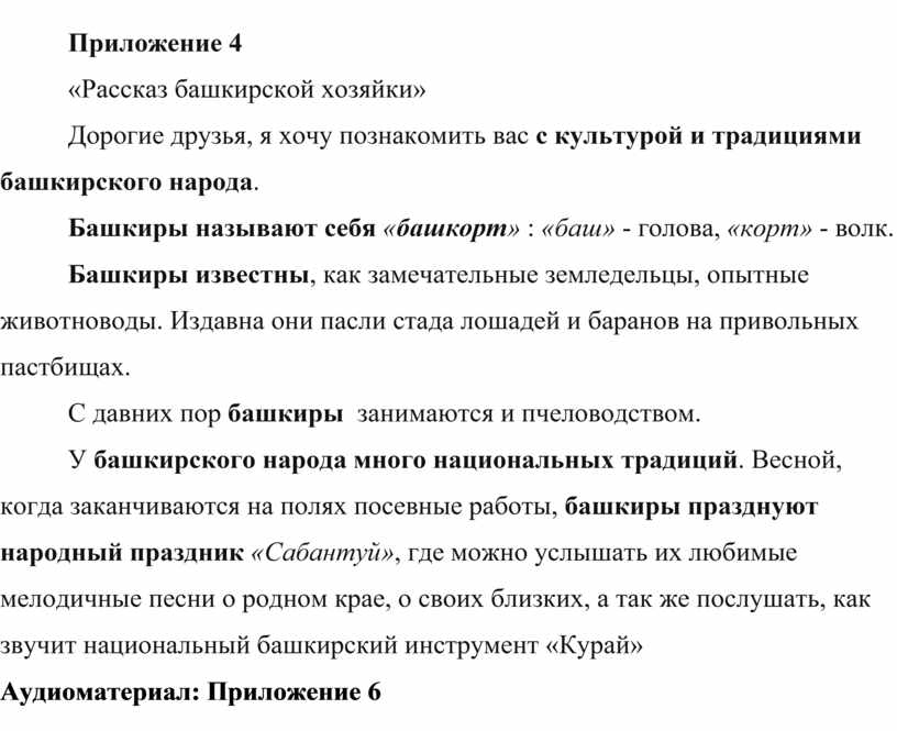 Добрый день! Меня зовут Илемпи. Мир вам, гости дорогие! Вы явились в добрый час! Встречу теплую такую приготовила для вас! Рада приветствовать вас. По обычаю, любой человек в доме чуваша – гость. На стол ставят хлеб да соль. У меня очень старинное чувашское имя, которое означает – красавица. Илемпи: Разве это можно купить? Все, что вы видите, я сделала сама. Моя мама и бабушка научили меня. Дети вместе с «Илемпи» играют в игру Журавушка (Правила игры приложение 3) Под башкирскую национальную музыку выходит девочка в башкирском костюме и в руках держит «Чак Чак Здоровается на башкирском языке: Хәйерле көн! Добрый день! Дорогие друзья, я хочу познакомить вас с культурой и традициями башкирского народа (рассказ о башкирской культуре (приложение 4). Предлагаю вам послушать, как звучит Курай. Дети отвечают на вопрос.