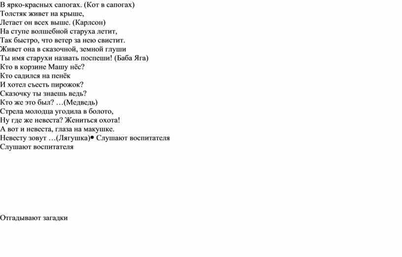 -Для этого вам нужно отгадать о каком герои эти слова: Была она артисткой Прекрасной, как звезда, От злого Карабаса Сбежала навсегда. (Мальвина) В гости к бабушке пошла, Пироги ей понесла. Серый Волк за ней следил, Обманул и проглотил.( Красная Шапочка) Лечит маленьких детей, Лечит птичек и зверей, Сквозь очки свои глядит Добрый доктор… (Айболит) Этот сказочный герой С хвостиком, усатый, В шляпе у него перо, Сам весь полосатый, Ходит он на двух ногах, В ярко-красных сапогах. (Кот в сапогах) Толстяк живет на крыше, Летает он всех выше. (Карлсон) На ступе волшебной старуха летит, Так быстро, что ветер за нею свистит. Живет она в сказочной, земной глуши Ты имя старухи назвать поспеши! (Баба Яга) Кто в корзине Машу нёс? Кто садился на пенёк И хотел съесть пирожок? Сказочку ты знаешь ведь? Кто же это был? …(Медведь) Стрела молодца угодила в болото, Ну где же невеста? Жениться охота! А вот и невеста, глаза на макушке. Невесту зовут …(Лягушка) |