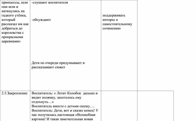 Воспитатель: Итак, начнем! ( колобок, ковер-самолет, облака). «По небу, в 109 Королевстве, на ковре-самолете летел Колобок Летел быстро, облака обгонял, по сторонам смотрел, о жизни своей нелегкой думал. И не заметил, как задремал. Проснулся Колобок от веселого смеха и видит»: объекты: Баба-Яга в ступе, Буратино, сапоги скороходы, замок Кощея Бессмертного. «Баба-Яга в ступе и Буратино в сапогах-скороходах соревнование устроили, кто быстрее в замок Кощея Бессмертного доберется. Никто не победил, зато очень весело было». «У трёх медведей поселился колобок, хотели они его съесть, но решили использовать его вместо говорящей колонки, ведь он много чего знал и мог всё про сказочную страну рассказать» «К трём поросятам пришёл в гости Винни-пух, и решили они все вмести отправится на поиски прекрасной принцессы, шли они шли и наткнулись на гадкого утёнка, который рассказал им как добраться до королевства с прекрасными царевнами» |