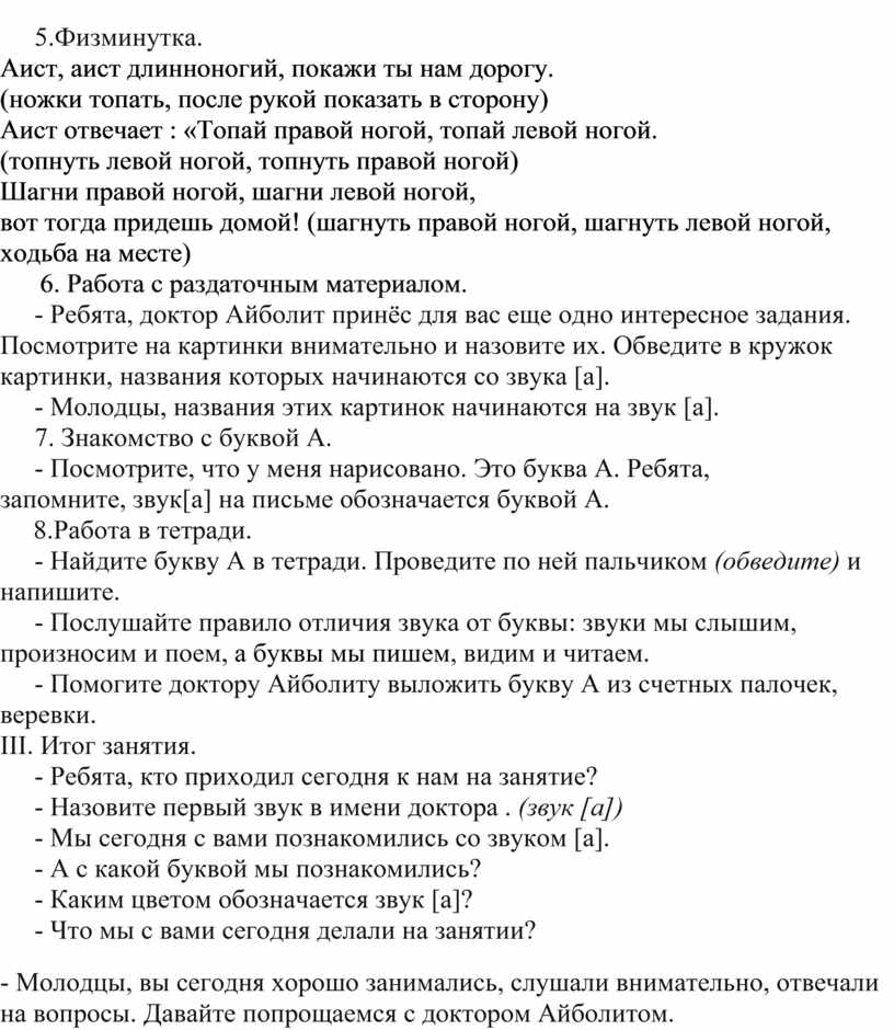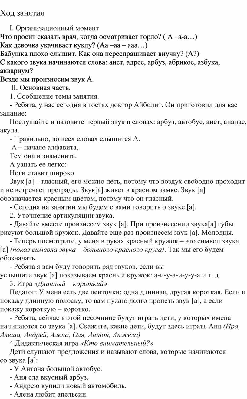 Оборудование: картинка с изображением доктора Айболита. Символ звука[а] – красный большой круг, красные ленточки разной длинны, карточка с буквой А, тетради.