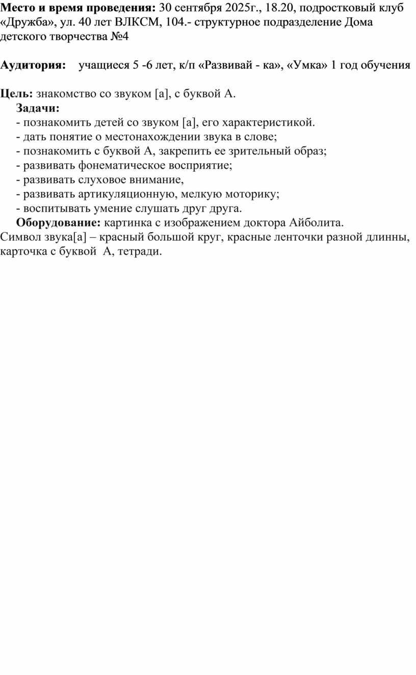 Место и время проведения: 30 сентября 2025г., 18.20, подростковый клуб «Дружба», ул. 40 лет ВЛКСМ, 104.- структурное подразделение Дома детского творчества №4