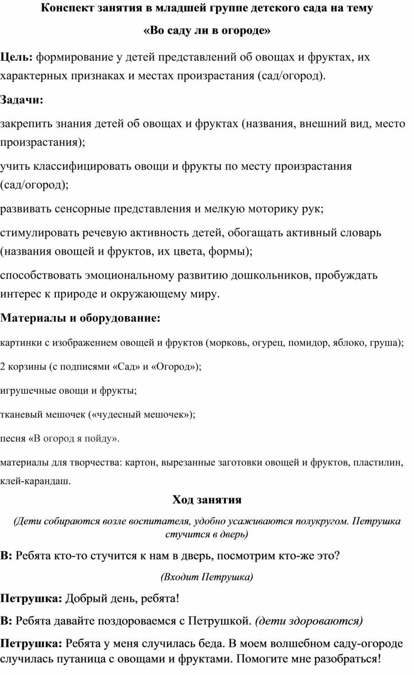 Конспект занятия в младшей группе детского сада на тему