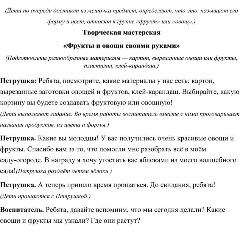 Петрушка. Какие вы молодцы! У вас получились очень красивые овощи и фрукты. Спасибо вам за то, что помогли мне разобрать всё в моём саду‑огороде. В награду я хочу угостить вас яблоками из моего волшебного сада!(Петрушка раздаёт детям яблоки.)