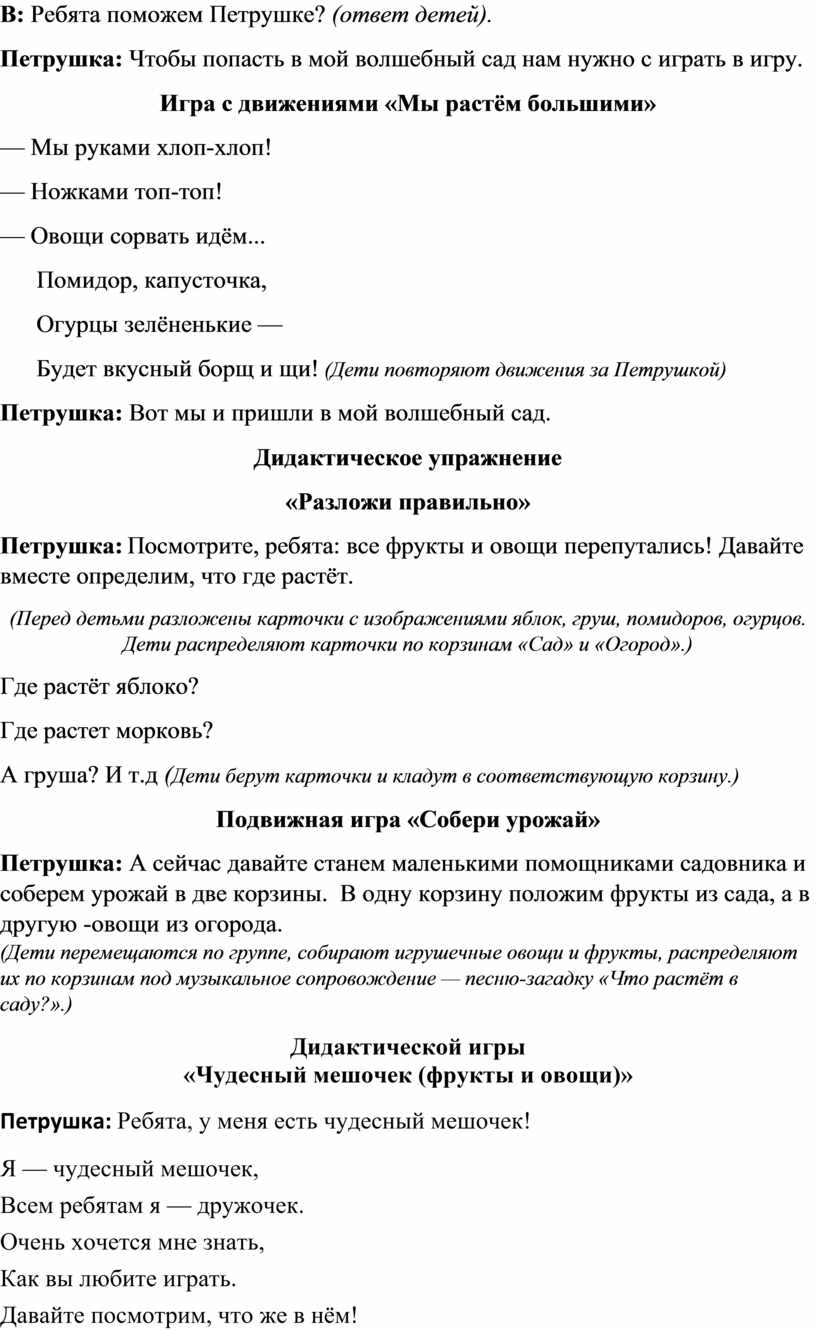 Цель: формирование у детей представлений об овощах и фруктах, их характерных признаках и местах произрастания (сад/огород).