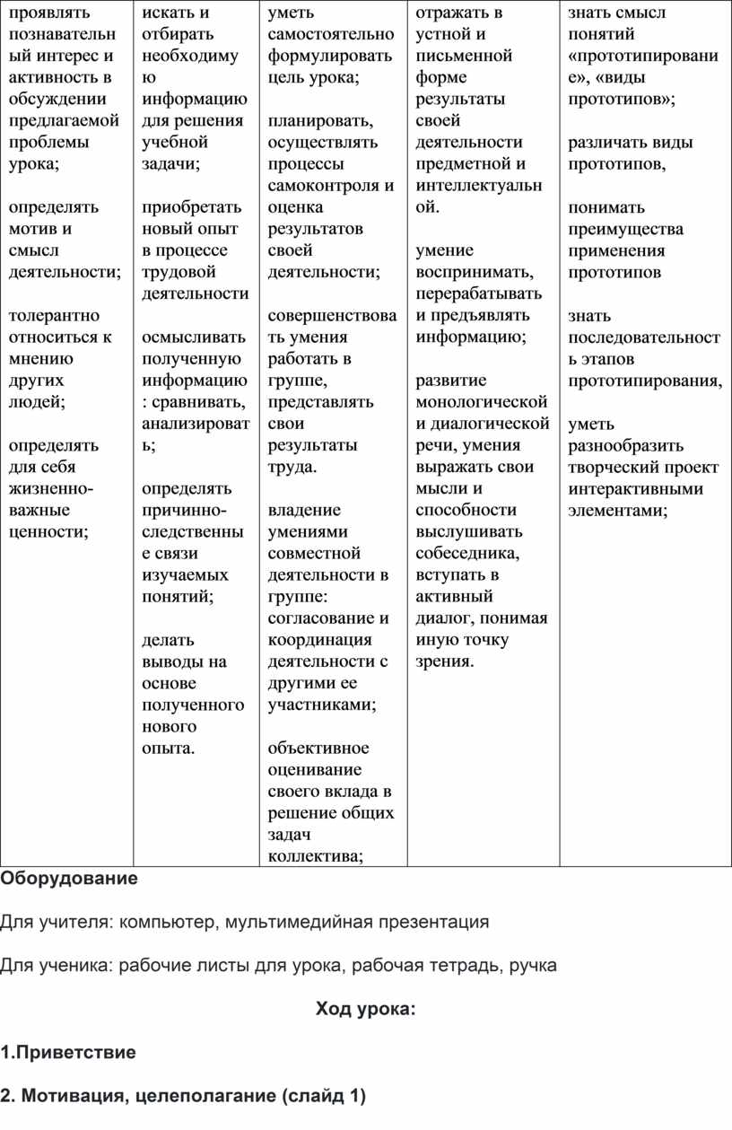 знать смысл понятий «прототипирование», «виды прототипов»; различать виды прототипов, понимать преимущества применения прототипов знать последовательность этапов прототипирования, уметь разнообразить творческий проект интерактивными элементами; |