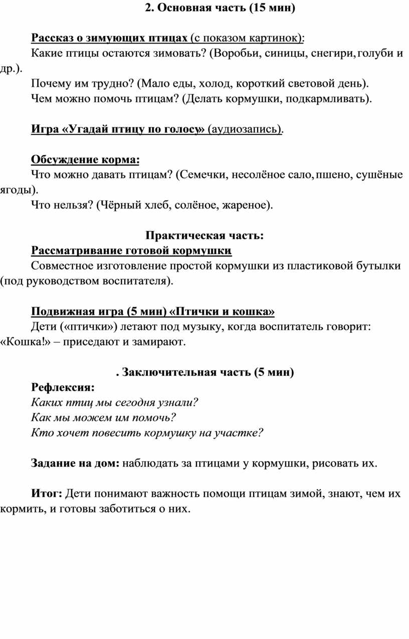 Итог: Дети понимают важность помощи птицам зимой, знают, чем их кормить, и готовы заботиться о них.