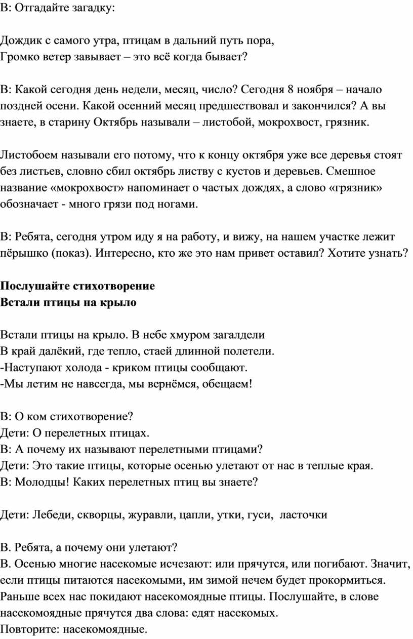 - Расширять и закреплять знания детей о внешнем виде, питании и поведении перелётных птиц, об особенности отлёта птиц на юг.